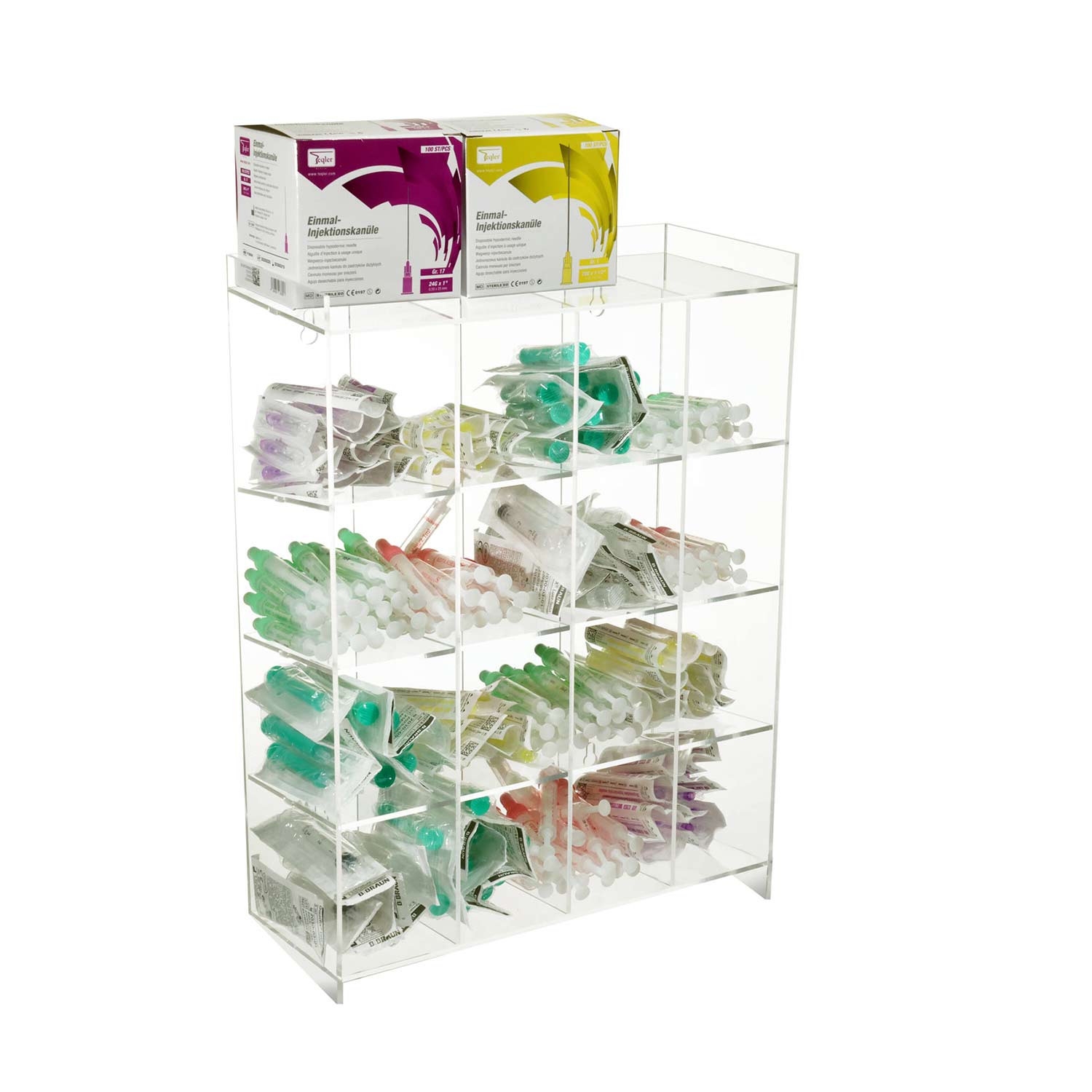 Der Spender besteht aus langlebigem Acryl und bietet eine stabile, hygienische Lösung mit glatten, leicht zu reinigenden Oberflächen. Je nach Bedarf ist der Materialspender mit 3 oder 4 Fächern erhältlich und lässt sich damit flexibel an unterschiedliche Anforderungen und Materialsortimente anpassen.